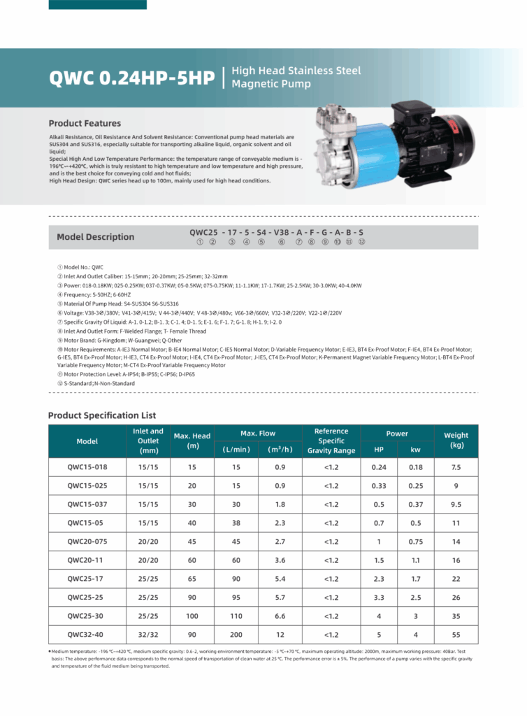 High Head Stainless Steel Magnetic Pump รุ่น QWC Series จาก CHEMTAI คือ Magnetic Drive Pump ที่ออกแบบมาโดย ไม่มีซีลเพลา (Seal-less Design) ช่วยป้องกันการรั่วไหลของของเหลว ปั๊มรุ่นนี้ทำจาก วัสดุสแตนเลส (Stainless Steel) ที่ทนทานต่อสารเคมีและอุณหภูมิสูง เหมาะสำหรับการใช้งานในระบบที่ต้องการ สูบของเหลวที่มีฤทธิ์กัดกร่อน เช่น กรด, ด่าง, น้ำมัน, และ สารทำละลาย